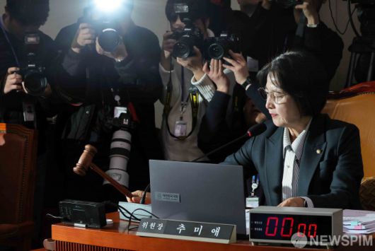 [서울=뉴스핌] 윤창빈 기자 = 추미애 국회 법제사법위원장이 7일 서울 여의도 국회에서 열린 법제사법위원회 전체회의에서 의사봉을 두드리고 있다. 2026.01.07 pangbin@newspim.com