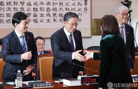 [서울=뉴스핌] 윤창빈 기자 = 나경원 국민의힘 의원이 7일 서울 여의도 국회에서 열린 법제사법위원회 전체회의에서 정성호 법무부 장관과 새해 인사를 나누며 악수하고 있다. 2026.01.07 pangbin@newspim.com