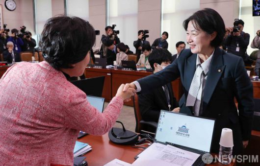 [서울=뉴스핌] 윤창빈 기자 = 추미애 국회 법제사법위원장이 7일 서울 여의도 국회에서 열린 법제사법위원회 전체회의에서 국민의힘 의원들과 새해 인사를 나누고 있다. 2026.01.07 pangbin@newspim.com |