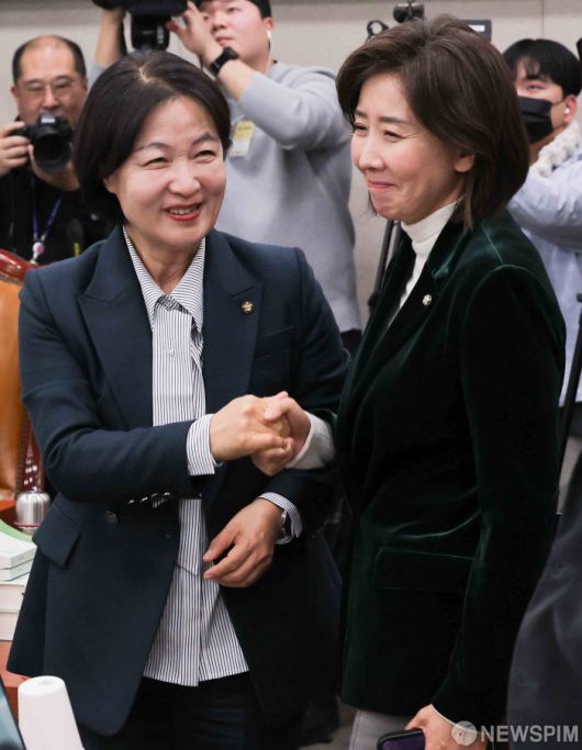[서울=뉴스핌] 윤창빈 기자 = 추미애 국회 법제사법위원장, 나경원 국민의힘 의원이 7일 서울 여의도 국회에서 열린 법제사법위원회 전체회의에서 새해 인사를 나누며 악수하고 있다. 2026.01.07 pangbin@newspim.com