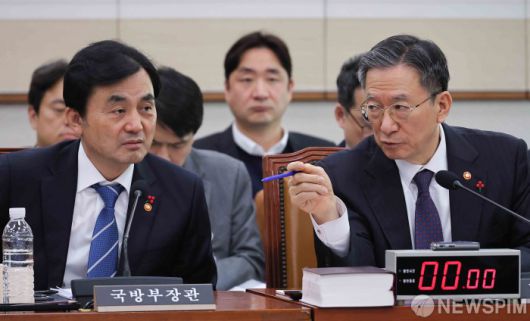 [서울=뉴스핌] 윤창빈 기자 = 정성호 법무부 장관, 안규백 국방부 장관이 7일 서울 여의도 국회에서 열린 법제사법위원회 전체회의에서 대화를 나누고 있다. 2026.01.07 pangbin@newspim.com |