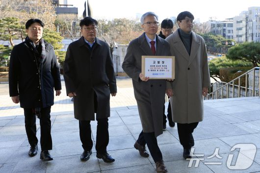 김택우 대한의사협회 회장과 관계자 등이 지난달 12일 오전 서울 서초동 대검찰청 앞에서 감사원 감사로 확인된 의대 정원 증원 위법 추진한 전 대통령 및 관계자 고발 기자회견을 마친 뒤 고발장 제출을 위해 민원실로 향하고 있다. /뉴스1 ⓒ News1 박정호 기자 |