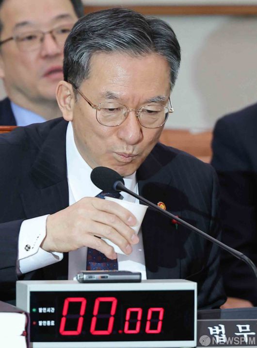 [서울=뉴스핌] 윤창빈 기자 = 정성호 법무부 장관이 7일 서울 여의도 국회에서 열린 법제사법위원회 전체회의에서 물을 마시고 있다. 2026.01.07 pangbin@newspim.com