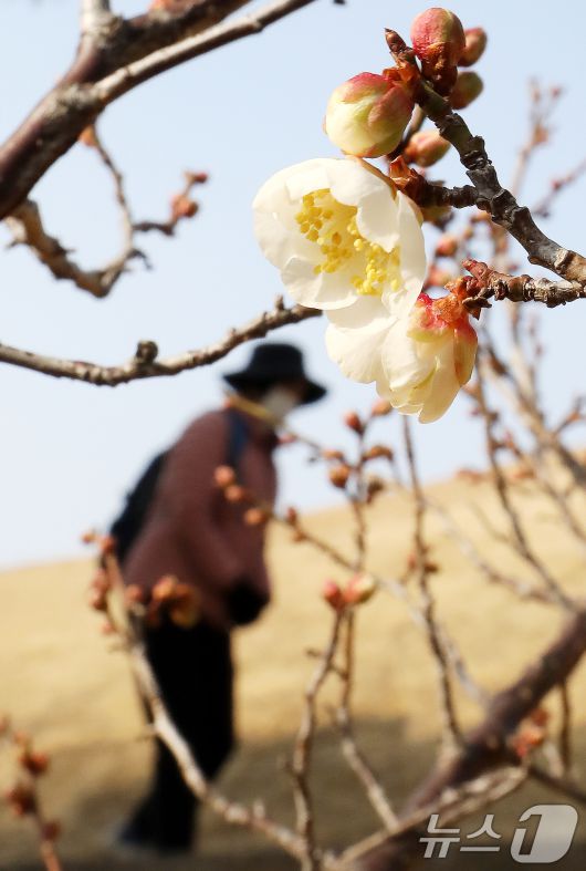 (부산=뉴스1) 윤일지 기자 = 7일 부산 동래구 복천동의 한 매화나무에 봄의 전령사 매화가 꽃망울을 터뜨려 눈길을 끌고 있다. 2026.1.7/뉴스1