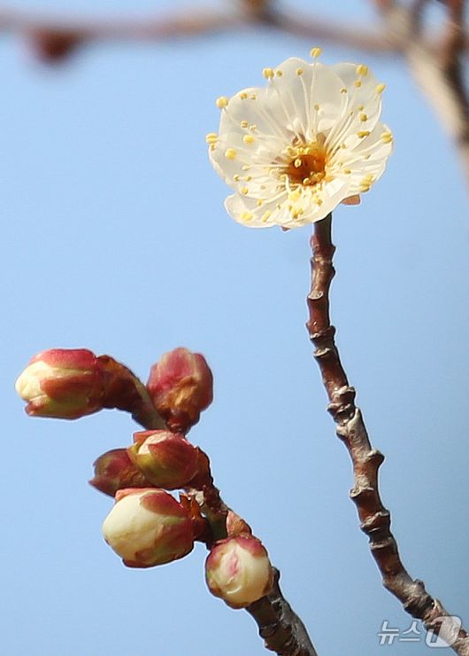 (부산=뉴스1) 윤일지 기자 = 7일 부산 동래구 복천동의 한 매화나무에 봄의 전령사 매화가 꽃망울을 터뜨려 눈길을 끌고 있다. 2026.1.7/뉴스1
