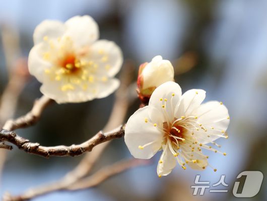 (부산=뉴스1) 윤일지 기자 = 7일 부산 동래구 복천동의 한 매화나무에 봄의 전령사 매화가 꽃망울을 터뜨려 눈길을 끌고 있다. 2026.1.7/뉴스1