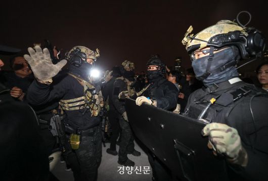 윤석열 전 대통령이 비상계엄을 선포한 후 자정을 넘긴 지난해 12월 4일 새벽 서울 여의도 국회의사당에 도착한 무장군인들이 국회 본청 진입을 시도하자 국회 직원 등이 막아서고 있다. 성동훈 기자 |