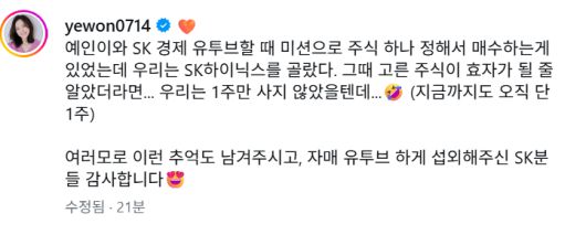 장예원은 최근 자신의 인스타그램을 통해 “예인이와 SK 경제 유튜브할 때 미션으로 주식 하나 정해서 매수하는 게 있었는데 우리는 SK하이닉스를 골랐다”며 당시를 회상했다.