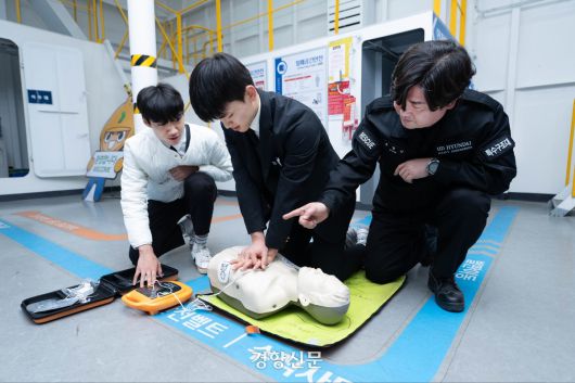 식당 아르바이트를 하다 의식을 잃은 노인을 구조한 윤재준 문현서 군이 6일 윤 군의 아버지 HD현대중공업 윤형민 기사로부터 심폐소생술 교육을 받고 있다. HD현대중공업 제공 |