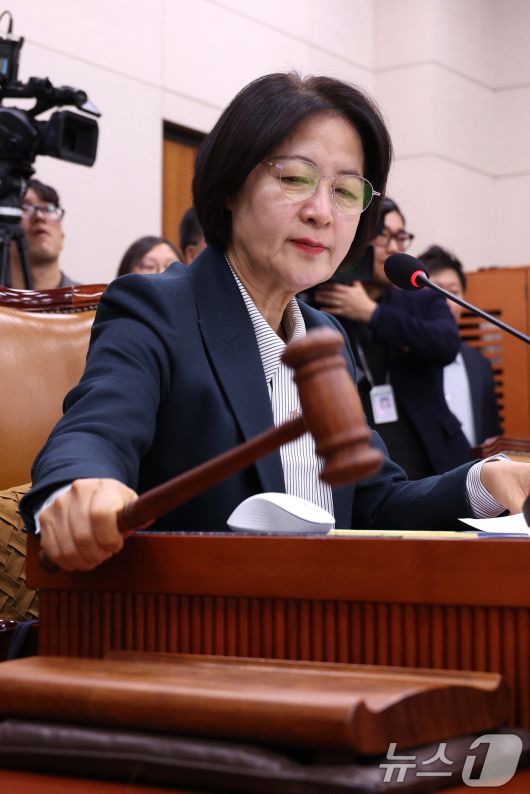 (서울=뉴스1) 신웅수 기자 = 추미애 위원장이 7일 서울 여의도 국회에서 열린 법제사법위원회 전체회의에서 의사봉을 두드리고 있다. 2026.1.7/뉴스1phonalist@news1.krCopyright ⓒ 뉴스1. All rights reserved. 무단 전재 및 재배포, AI학습 이용 금지.