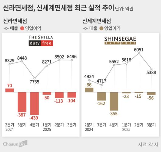 7일 증권업계에 따르면, 신라면세점과 신세계면세점은 지난해 4분기에도 수십억원 규모의 영업손실을 기록할 것으로 관측됐다. 두 업체 모두 6개 분기 연속 적자를 내는 것이다. 신라면세점은 이미 2024년 3분기부터 작년 3분기까지 5개 분기 연속 1093억원 규모의 영업손실이 누적됐고, 신세계면세점도 같은 기간 611억원 규모의 적자가 쌓였다.