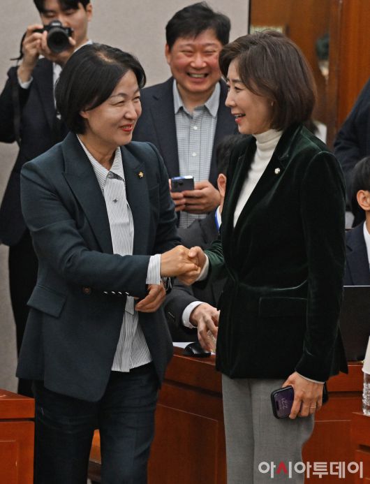 아시아투데이 송의주 기자 = 국회 법제사법위원회 추미애 위원장(왼쪽)과 나경원 국민의힘 의원이 7일 국회에서 열린 법제사법위원회 전체회의에서 새해 인사를 나누고 있다. ⓒ "젊은 파워, 모바일 넘버원 아시아투데이"