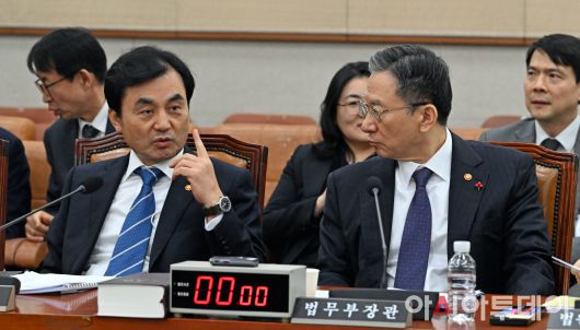 아시아투데이 송의주 기자 = 정성호 법무부 장관(오른쪽)과 안규백 국방부 장관이 7일 국회에서 열린 법제사법위원회 전체회의에서 이야기를 나누고 있다. ⓒ "젊은 파워, 모바일 넘버원 아시아투데이"
