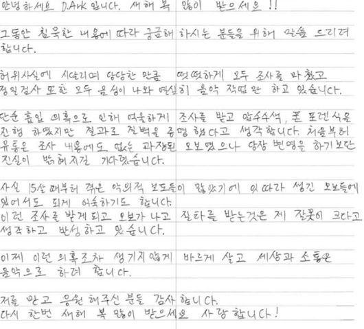 디아크는 7일 인스타그램에 자필 편지를 올리고 "허위사실에 시달리며 당당한 만큼 떳떳하게 모두 조사를 마쳤고 정밀검사 또한 모두 음성이 나와 열심히 음악 작업만 하고 있다"라고 밝혔다.