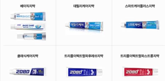 | 보존제 성분인 트리클로산이 혼입된 2080 치약 6종 / 사진=애경산업 홈페이지 |