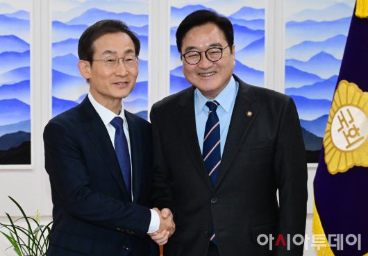 아시아투데이 이병화 기자 = 우원식 국회의장이 7일 국회를 찾은 김호철 신임 감사원장과 인사를 나누고 있다.