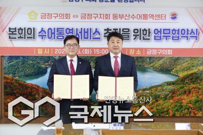[김옥빈 기자] (부산=국제뉴스) 김옥빈 기자 = 부산 금정구의회는 지난 6일, 금정구의회 의장실에서 동부산수어통역센터와 '본회의 수어 통역 서비스 제공을 위한 업무협약(MOU)'을 체결했다고 7일 밝혔다.