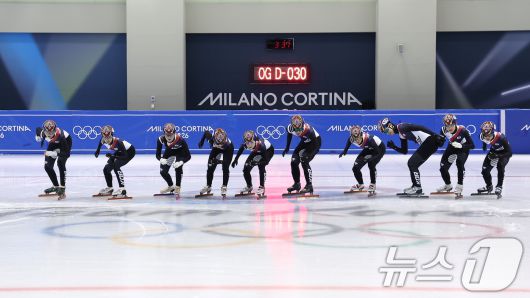 (진천=뉴스1) 김성진 기자 = 쇼트트랙 선수들이 7일 충북 진천선수촌 챔피언하우스에서 열린 2026 밀라노코르티나동계올림픽대회 D-30 미디어데이 및 훈련 공개에서 출발 포즈를 취하고 있다. 2026.1.7/뉴스1