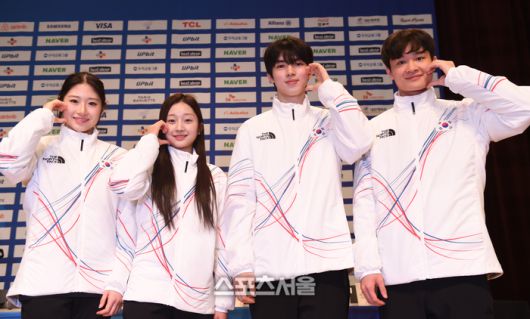피겨 이해인, 신지아,차준환, 김현겸(왼쪽부터)이 7일 진천 국가대표선수촌에서 열린 2026 밀라노코르티나동게올림픽대회 D-30 미디어데이에서 포즈를 취하고 있다.