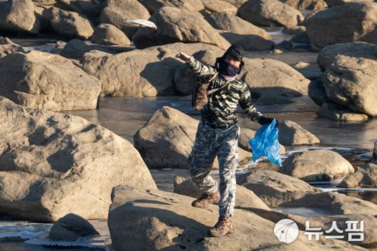 [남양주=뉴스핌] 류기찬 기자 = 일부 몰지각한 아마추어 사진가들이 희귀 겨울철새인 참수리(멸종위기 야생생물 I급, 천연기념물 243-3호)의 물고기 사냥 장면을 근접 촬영하기 위해 경기 남양주시 와부읍 팔당댐 인근에 위치한 상수원보호구역 내에 무단으로 냉동 물고기를 투척하는 모습이 뉴스핌 카메라에 포착됐다.