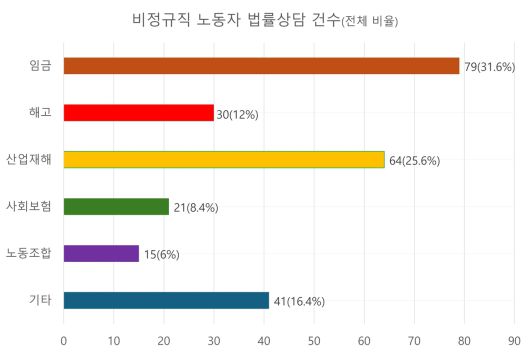 이어 ▷산업재해 상담 64건(25.6%) ▷직장 내 괴롭힘 등 기타 상담 41건(16.4%) ▷해고 상담 30건(12%) ▷실업급여 등 사회보험 상담 21건(8.4%) ▷노동조합 상담 15건(6%)이었다. 임금과 산업재해, 해고 문제가 전체 상담의 70% 가까이 차지했다.
