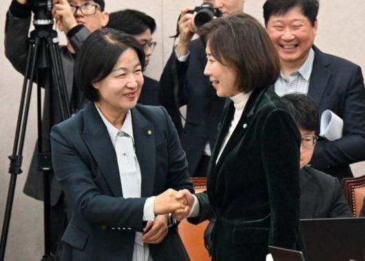 7일 국회에서 열린 법제사법위원회 전체회의에서 더불어민주당 소속 추미애 위원장(왼쪽)과 나경원 국민의힘 의원이 악수하고 있다. <ⓒ투자가를 위한 경제콘텐츠 플랫폼, 아시아경제(www.asiae.co.kr) 무단전재 배포금지>