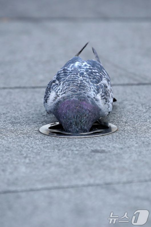 (대구=뉴스1) 공정식 기자 = 7일 오후 대구 중구 동성로 바닥분수에서 비둘기 한 마리가 물구멍(분사구)에 머리까지 집어넣은 채 먹이를 찾고 있다. 2026.1.7/뉴스1