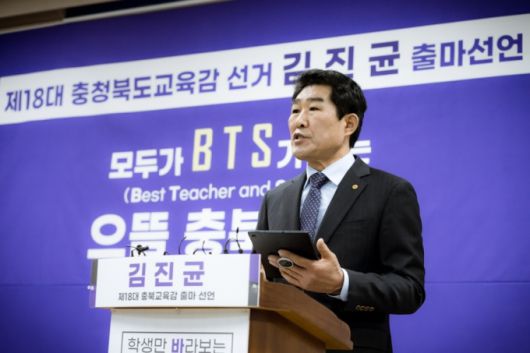 [청주=뉴스핌] 백운학 기자 = 충북교육감 선거판이 벌써부터 요동치고 있다. 33년간 교단과 행정을 두루 거친 김진균 청주시체육회장이 7일 "무너진 충북교육의 질서를 바로 세우겠다"며 출사표를 던졌다.