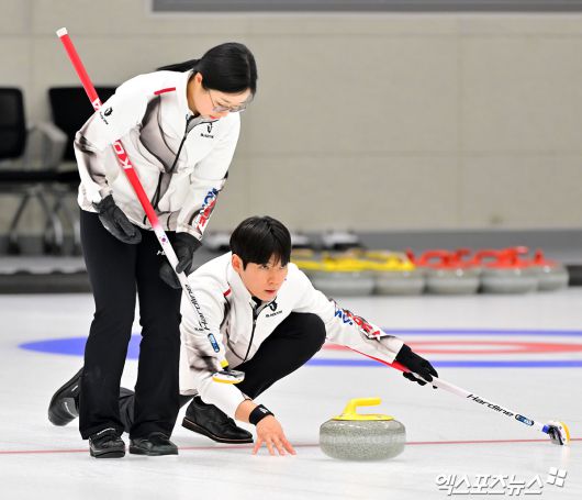 (엑스포츠뉴스 진천, 김한준 기자) 7일 오후 충북 대한체육회 진천국가대표선수촌에서 열린 2026 밀라노코르티나동계올림픽대회 D-30 훈련공개, 믹스더블 김선영-정영석이 훈련에 임하고 있다.김한준 기자 kowel@xportsnews.com