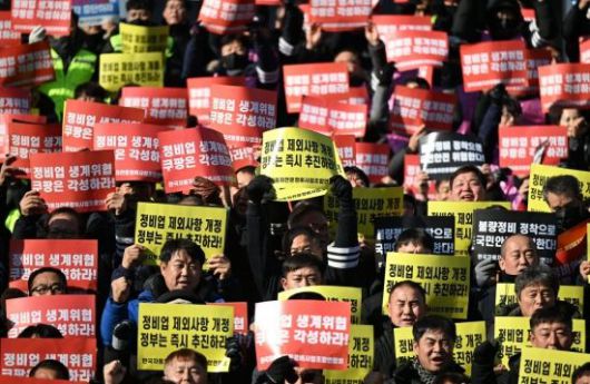 7일 국회 본청 앞 계단에서 한국외식업중앙회 등 자영업자 단체들이 쿠팡 규탄대회를 하고 있다. <ⓒ투자가를 위한 경제콘텐츠 플랫폼, 아시아경제(www.asiae.co.kr) 무단전재 배포금지>