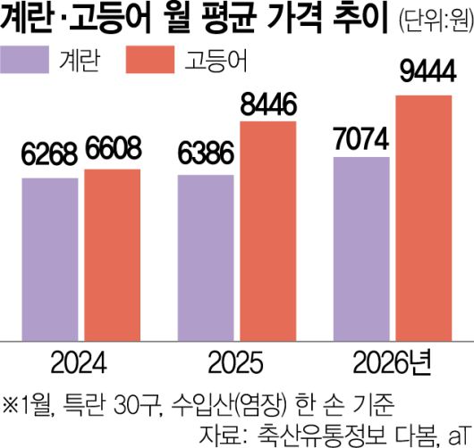 고등어 가격도 오름세다. 해양수산부에 따르면 지난해 12월 수입산 고등어 한 손(2마리)의 소매가격은 평균 1만 363원으로 전달에 비해 500원 올랐고 1년 전과 비교하면 2000원 상승해 28.8% 뛰었다. 연초부터 밥상물가가 치솟자 정부도 전방위적인 대응에 나선 것이다.