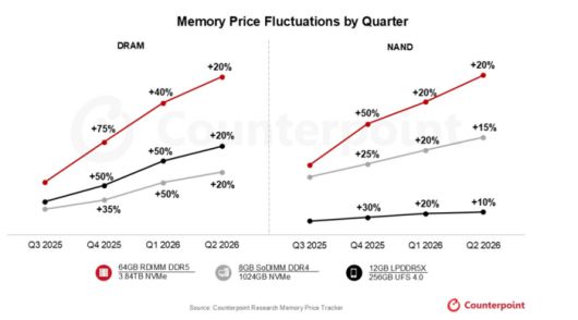 시장조사업체 카운터포인트리서치는 “메모리 시장이 초고속 상승 국면이 진입했으며 현재 시황은 사상 최고치(2018년)를 경신하고 있다”며 “지난해 4분기 가격은 40~50% 상승이 예상된다”고 밝혔다.