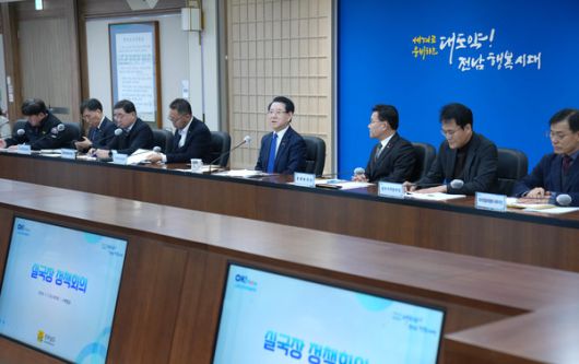 김영록 전라남도지사가 7일 도청 서재필실에서 실국장 정책회의를 주재하고 도정 현안을 논의하고 있다.@전남도청 |