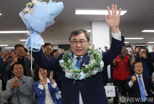 [서울=뉴스핌] 이호형 기자 = 진보진영 정근식 서울시 교육감 후보가 16일 치러진 서울시 교육감 보궐선거에서 당선 된 후 마포구 캠프 지지자의 축하 꽃다발을 받고 환호하고 있다. 2024.10.16 leemario@newspim.com |