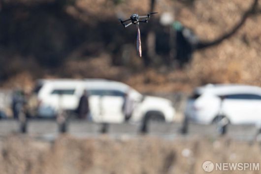 [남양주=뉴스핌] 류기찬 기자 = 7일 오전 경기 남양주시 와부읍 팔당댐 인근 상수원보호구역에서 일부 몰지각한 아마추어 사진가가 멸종위기 야생생물 I급으로 지정된 참수리의 물고기 사냥 장면을 근접 촬영하기 위해 냉동 물고기를 드론을 이용해 한강에 투척하고 있다. 참수리는 전 세계의 약 4000여 마리밖에 남지 않은 희귀 겨울 철새로, 국내에는 팔당댐 인근에 매년 1~3마리가 정기 도래하고 있다. 2026.01.07 ryuchan0925@newspim.com