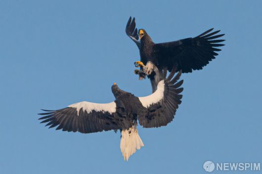 [남양주=뉴스핌] 류기찬 기자 = 7일 오전 경기 남양주시 와부읍 팔당댐 인근 상수원보호구역에서 참수리 2마리가(멸종위기 야생생물 I급, 천연기념물 243-3호) 발톱을 치켜세우고 경쟁을 펼치고 있다. 참수리는 전 세계의 약 4000여 마리밖에 남지 않은 희귀 겨울 철새로, 국내에는 팔당댐 인근에 매년 1~5마리가 정기 도래하고 있다. 2026.01.07 ryuchan0925@newspim.com