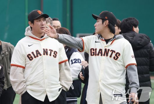 미국 프로야구 메이저리그(MLB) 샌프란시스코 자이언츠 이정후가 7일 경기 이천시 LG 챔피언스파크에서 황재균과 이야기를 나누고 있다. 2026.1.7/뉴스1 ⓒ News1 김영운 기자 |