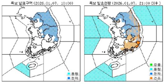 한파특보 중 '한파주의보'는 아침 최저기온이 전날보다 10℃ 이상 하강하여 3℃ 이하이면서 평년값보다 3℃ 이상 낮을 것으로 예상되거나 아침 최저기온이 전날보다 12℃ 이하인 날이 2일 이상 지속될 것으로 예상될 때 발효된다.
