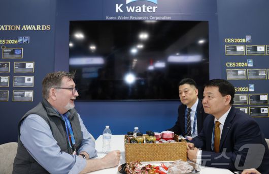 (서울=뉴스1) = 6일(현지시간) 미국 라스베이거스에서 열린 CES 2026에서 윤석대 한국수자원공사 사장(오른쪽)이 브라이언 스텁스 클리블랜드 워터얼라이언스(CWA) 회장(왼쪽)과 면담하고 있다. (한국수자원공사 제공. 재판매 및 DB 금지) 2026.1.7/뉴스1