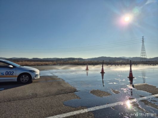 지난 6일 오전 경기도 화성 한국교통안전공단(TS) 화성교통안전체험센터에 '가상 빙판도로'가 조성됐다. 도로 바닥에는 총 3개 차선에 걸쳐 대리석 타일이 깔려 있었다. 이 중 절반만 대리석인 양쪽 차선과 달리 중앙은 전체가 대리석이었다. 도로 옆에 설치된 기계에서는 물이 나오고 있었다. 두발로 위에 올라서자 균형을 제대로 잡지 않으면 넘어질 수 있을 정도로 미끄러웠다. 바닥은 손을 대자 얼음처럼 차가웠다.
