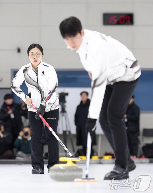 (진천=뉴스1) 김성진 기자 = 컬링 믹스더블 김선영과 정영석이 7일 충북 진천선수촌 챔피언하우스에서 열린 2026 밀라노코르티나동계올림픽대회 D-30 미디어데이 및 훈련 공개에서 훈련을 하고 있다. 2026.1.7/뉴스1
