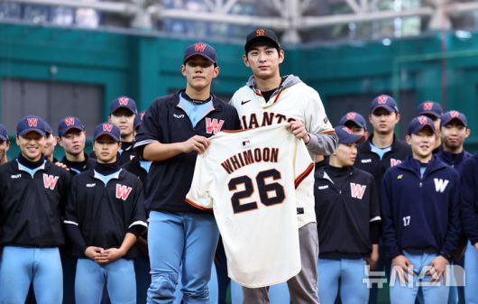 [이천=뉴시스] 최진석 기자 = 샌프란시스코 자이언츠 이정후가 7일 오후 경기 이천 LG 챔피언스파크에서 열린 샌프란시스코 자이언츠 야구 클리닉에 앞서 모교인 휘문고 야구부에 유니폼을 전달하며 기념촬영하고 있다. 2026.01.07. myjs@newsis.com |