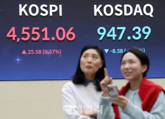 [이데일리 김태형 기자] 7일 서울 영등포구 한국거래소 홍보관 현황판에 코스피, 코스닥 지수가 표시되고 있다. 이날 코스피는 전 거래일 대비 25.58포인트(0.57%) 오른 4551.06, 코스닥은 8.58포인트(0.90%) 하락한 947.39으로 장을 마쳤다.