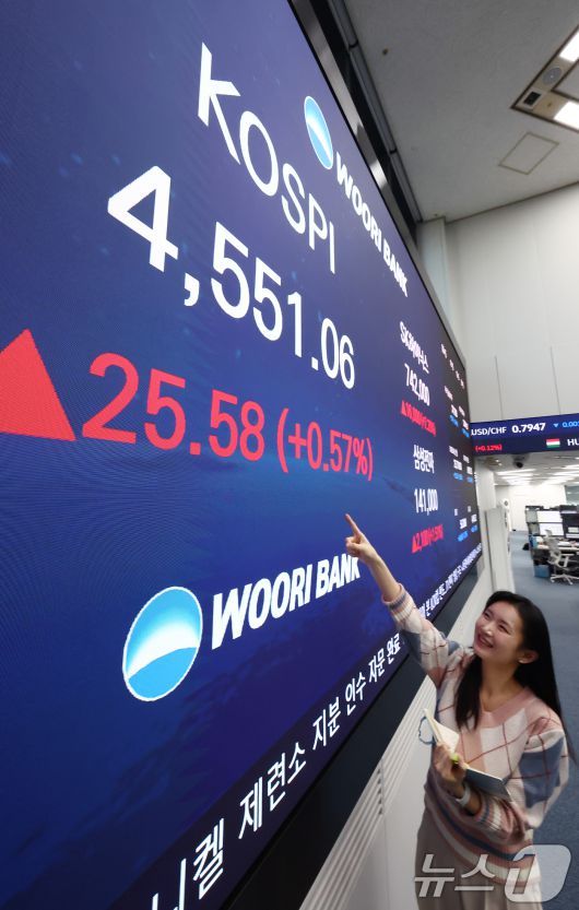 (서울=뉴스1) 김민지 기자 = 7일 오후 서울 중구 우리은행 본점 딜링룸 전광판에 종가가 나오고 있다. 이날 코스피는 전 거래일 대비 25.58포인트(0.57%) 오른 4551.06, 코스닥은 8.58포인트(0.90%) 하락한 947.39으로 장을 마쳤다. 한편 삼성전자 주가는 14만원대를 기록했다. 2026.1.7/뉴스1