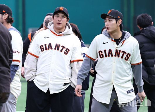 [이천=뉴시스] 최진석 기자 = 샌프란시스코 자이언츠 이정후가 7일 오후 경기 이천 LG 챔피언스파크에서 열린 샌프란시스코 자이언츠 야구 클리닉에 앞서 은퇴한 황재균과 대화를 나누고 있다. 2026.01.07. myjs@newsis.com |