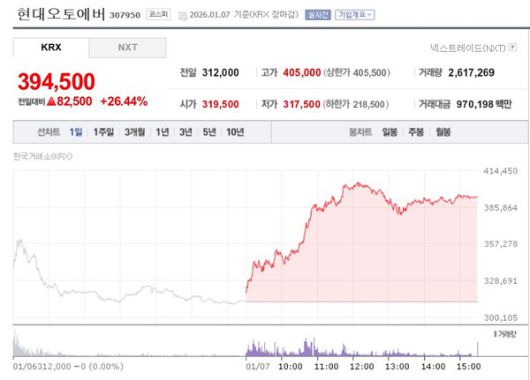 7일 한국거래소에 따르면 현대오토에버가 전일 종가 대비 26.4% 상승한 39만4500원으로 장을 마감했다. 이날 주가는 장중 한때 신고가를 경신하기도 했다. 현대차그룹에서 추진하는 로보틱스 전략이 영향을 미친 것으로 보인다.