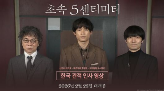 국내 개봉을 앞둔 '초속 5센티미터'는 '너의 이름은', '날씨의 아이', '스즈메의 문단속'을 연출한 원작자 신카이 마코토 감독과, 실사 영화의 연출을 맡은 오쿠야마 요시유키 감독, 주연 배우 마츠무라 호쿠토가 참여한 한국 관객 인사 영상을 공개했다.
