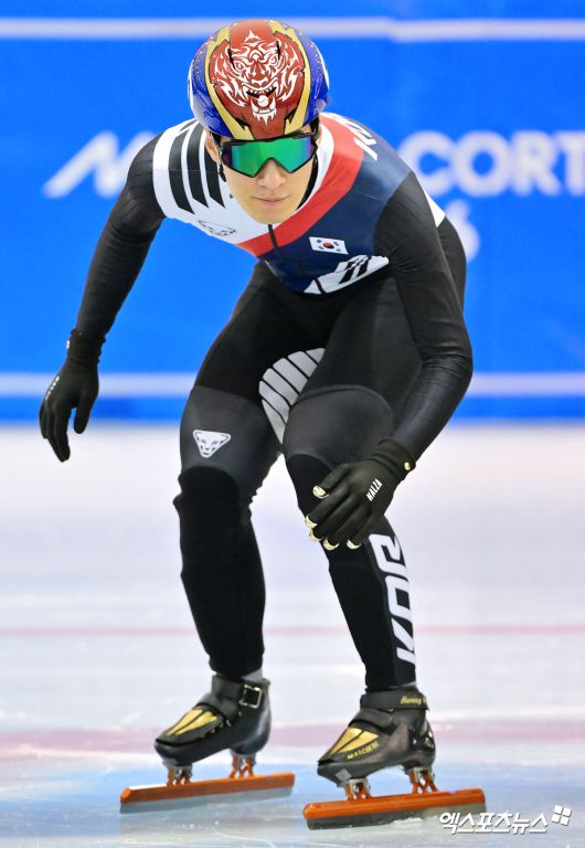 (엑스포츠뉴스 진천, 김한준 기자) 7일 오후 충북 대한체육회 진천국가대표선수촌에서 열린 2026 밀라노코르티나동계올림픽대회 D-30 훈련공개, 쇼트트랙 황대헌이 스타트 포즈를 취하고 있다.김한준 기자 kowel@xportsnews.com