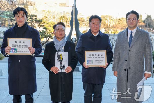 (서울=뉴스1) 안은나 기자 = 더불어민주당 정치검찰 조작기소대응 특별위원회 한준호 위원장(왼쪽부터)과 박선원, 이기헌, 전용기 의원이 7일 오후 서울 서초구 대검찰청을 찾아 쌍방울그룹 대북 송금 사건과 관련, 김성태 전 회장 등에 대해 쌍방울 관련 증인 진술 번복 및 회유의혹, 조사절차 위법 의혹 고발장과 박상용 검사 등에 대한 직권남용죄 등의 혐의 감찰의뢰서를 제출하기 전 취지를 밝히고 있다. 2026.1.7/뉴스1