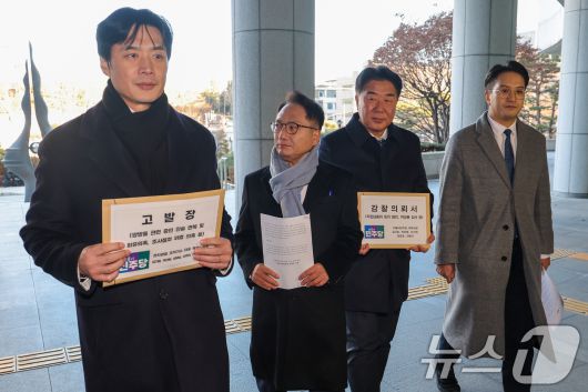 (서울=뉴스1) 안은나 기자 = 더불어민주당 정치검찰 조작기소대응 특별위원회 한준호 위원장(왼쪽부터)과 박선원, 이기헌, 전용기 의원이 7일 오후 서울 서초구 대검찰청을 찾아 쌍방울그룹 대북 송금 사건과 관련, 김성태 전 회장 등에 대해 쌍방울 관련 증인 진술 번복 및 회유의혹, 조사절차 위법 의혹 고발장과 박상용 검사 등에 대한 직권남용죄 등의 혐의 감찰의뢰서를 제출하기 위해 민원실로 향하고 있다. 2026.1.7/뉴스1